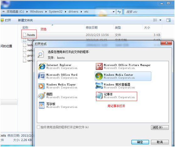 2. 雙擊 hosts 選擇記事本打開(kāi),刪掉里面全部?jì)热莺,文?保存退出即可